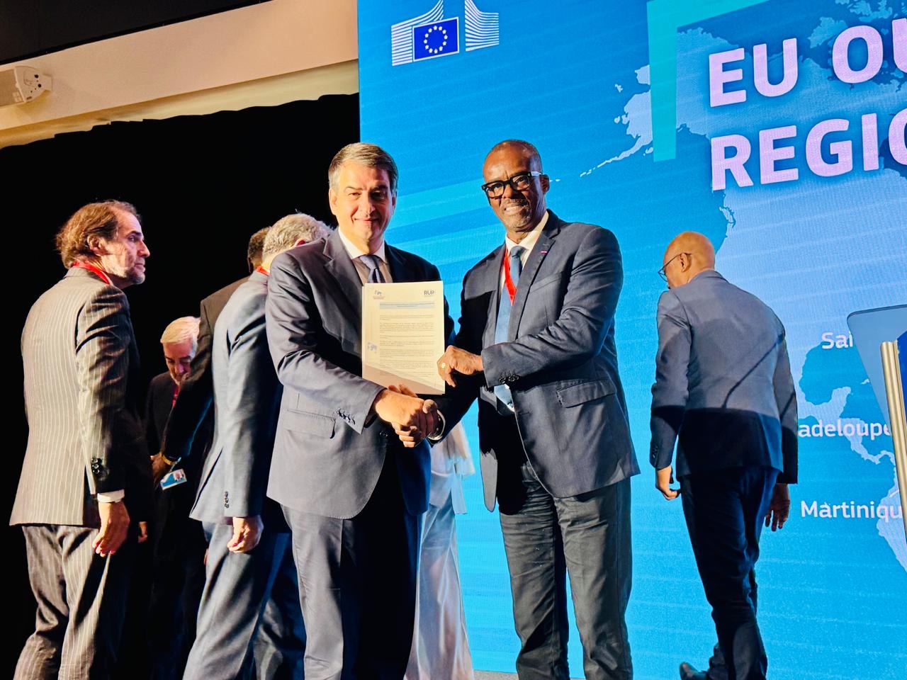 Dans le cadre du forum des RUP, du mardi 18 novembre, le Président de la CPRUP a remis avec les 8 autres Présidents des RUP au vice-président de la Commission Européenne Raffaele Fitto, la déclaration commune relative au futur Cadre Financier Pluriannuel (CFP) 2028-2034.